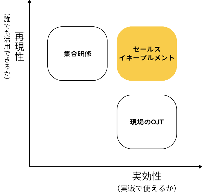 セールス・イネーブルメントは、こうした課題を解決するためのアプローチです。ハイパフォーマーの暗黙知を誰もが活用できるようにすることで、営業の成果を再現性のあるものにしていきます。