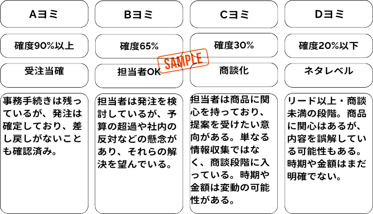 見込み数字や商談のネック、活動の質・量を多角的に分析することで、思考の客観性を高め、合理的な行動を促していきます。(「ヨミ」とは、契約確度・金額・時期・次の展開などを“読む”ことを意味します。)